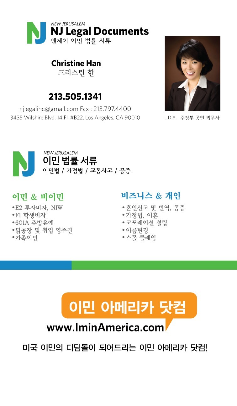 [이민아메리카]는 힘들고 어려운 케이스라 할지라도 오랫 동안의 경험과 실력으로 케이스를 승인 받아 드립니다. 모든 이민 관련 케이스 진행, 유학관련 , 결혼신고, 이혼 등 기타 법률서류를 가장 정확하게 도와드리고 있습니다. 무엇이든 궁금하신점 있으시면 언제든지 연락 주십시요.