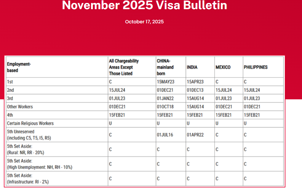 • 내용: 국무부 2025년 11월 비자블러틴은 대부분 범주에서 **전월과 동일(무변동)**이며, USCIS는 11월 접수에서 취업·가족 모두 ‘Dates for Filing’ 차트 적용을 공지했습니다. **접수 가능성(서류접수 기준)**을 다시 계산해보시기 바랍니다. Travel.state+2Goeschl Law+2