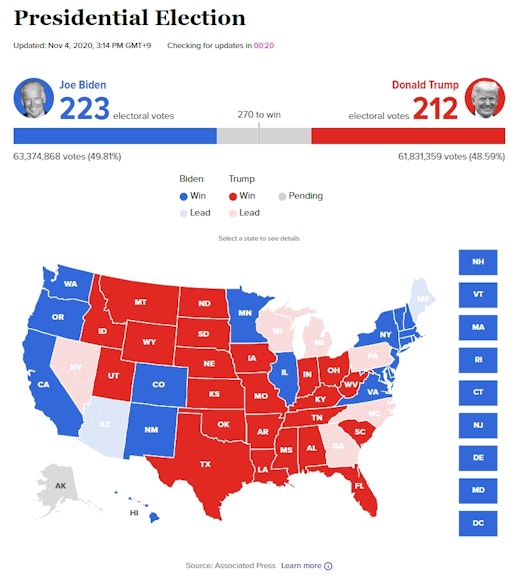 2020 미국 대선 실시간 개표 현황 속보(바이든 264vs 214 트럼프)